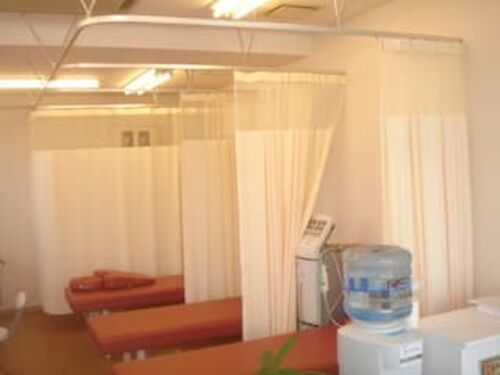 カーブ加工カーテンレールの中間吊と間仕切り防炎カーテン 病院・学校の保健室・フィッティングルームなどで施工する事の多い工事ですが、 最近は特に、整体・整骨院・マッサージ店などの開業に伴うご依頼が増えています。 施工前 床に仮置きして位置の確認…