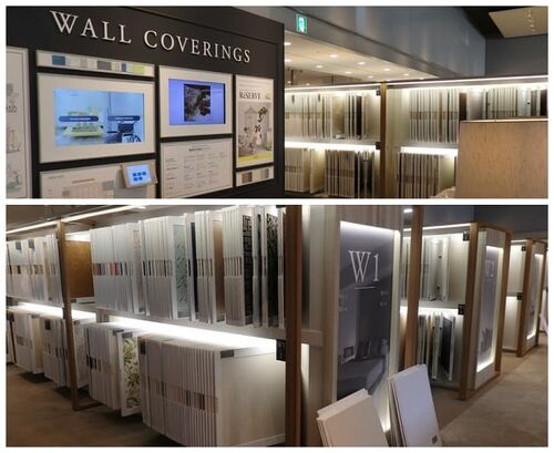 サンゲツ品川ショールーム こちらではサンゲツ製品、カーテン・壁紙(クロス)・カーペット・各種床材・椅子生地などが全点展示されています。 壁紙は90×90㎝のパネルに貼った状態で展示されており、見本帳だけよりは選び易くなっています。 気になる柄…