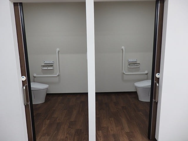 車いすの利用や介助を想定した広い開口部と個室スペースが2ヶ所、