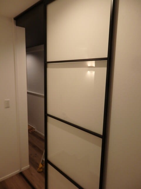 お部屋に調和するデザインの機能的な折戸を設置、壁クロスも近似の物を探し施工しました。