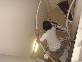 2011-08-09 らせん階段にカーペット貼り カーペット(タイル・オーダー・敷詰め) らせん階段のカーペット貼 先週末は大宮にある大きな総合病院の休日を利用しての床改修工事。 ここは知合いの業者さんからの仕事で頻繁に訪れる現場です。 平場の数倍手間のかかる階段の、さらに 数倍手間のかかるらせん階段も何のその、 坐骨神経痛発症前よりかえって体のキレが 良くなった感じでガッツリカーペット貼り、 良いリハビリになりました。
