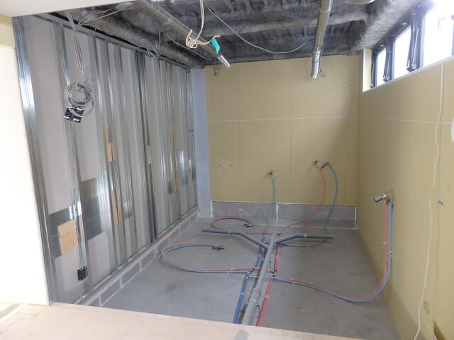 詳細図に基づき電源・給水・給湯・排水を配管、