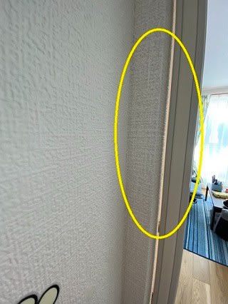 左)壁とドアのすき間を塞ぐための後付けの木枠。近似のクロス仕上げでスッキリ馴染んでいます