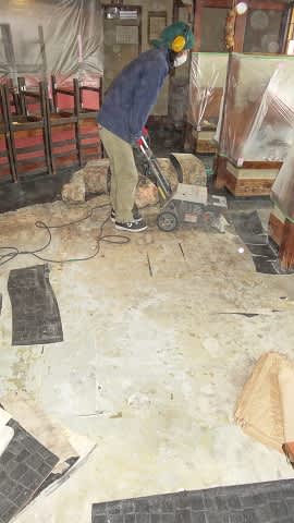既存床材はがし|専用の機械(ペッカー)を使用。ほこりが立ちますので、極力荷物は移動し