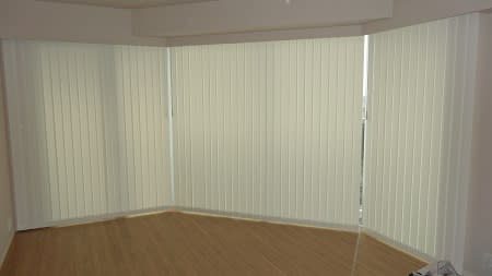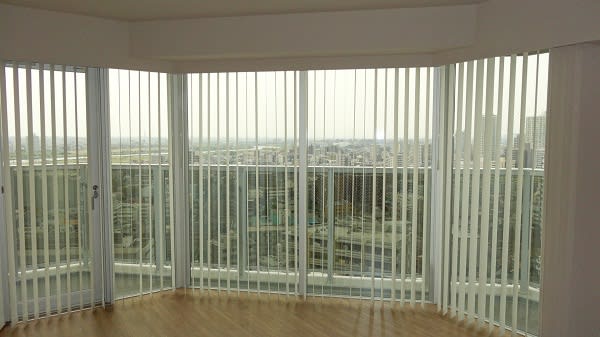 高層階で日射し豊富な台形の大きなテラス窓に映えるバーチカルブラインド、